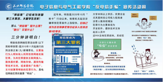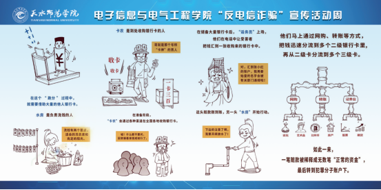 宣传活动重点介绍了“帮信罪”。结合“帮信罪”的法条原文,活动用“漫画图示+流程图解”的方式,深入浅出地解构了“卡农”“跑分”“水房”“话务员”等诈骗术语背后的犯罪套路,帮助大家在提高辨识诈骗套路能力的同时,也提高了对诈骗活动各环节的警惕性。本次活动,在校园人流量比较大的主要路段放置了醒目的反诈宣传展板,在学院电子大屏幕上实时滚动播放“反电信诈骗”的主题,充分利用了师生们的路途时间进行宣传,通过反复多次宣传的方式增强宣传效果。学院还在各班级组织“反电信诈骗”主题班会,为同学们讲述近年的校园诈骗案例,以真实故事加深同学们的印象,筑牢反诈骗的思想防线。