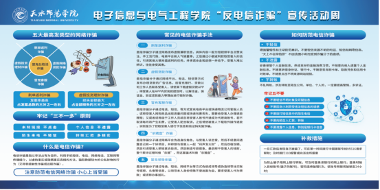 近年来,高校各类电信诈骗案件频发,学院总结了电信诈骗的常见套路:“人物(陌生人)+沟通(各种通信工具,见不到面)+要求(转账汇款)=诈骗(卷钱消失)”,归纳出九个“一律”、十个“凡是”的防诈骗技巧,告诫大家一定要时刻保持清醒头脑,避免上当受骗。