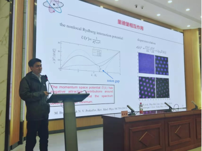 张晓斐教授介绍了玻色-爱因斯坦凝聚态的产生,超冷原子系统中的自旋轨道耦合和长程相互作用,分享了冷原子物理在高精度光钟、原子干涉仪、量子通讯、量子计算以及精密测量物理方面的应用。另外,张晓斐教授还介绍了软核玻色气体中的超固现象。